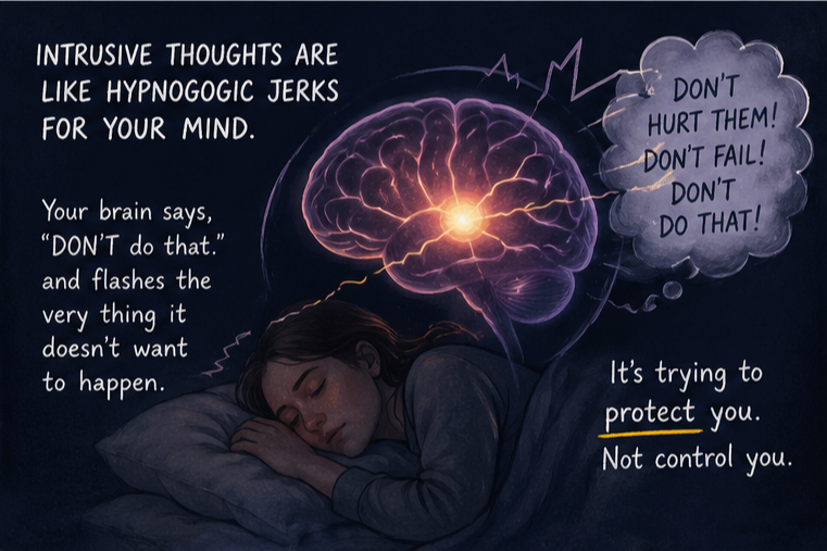 It does mean something. It’s just that all it means is that his hands flinched. In many ways, intrusive thoughts are a conscious version of a hypnogogic jerk. In a hypnogogic jerk, the act of falling asleep too fast means your brain jolts your nervous system in an attempt to keep you alive (as we currently understand it). In an intrusive thought; your brain flashes the very thing that it does NOT want to happen into your mind in a very full-frontal, and often anxiety inducing way.
